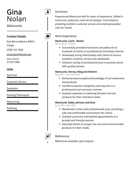 Manicurist Resume Sample - Highlight relevant experience in nail care, customer service, and sanitation. Livecareer provides examples with the best format, template & keyword. Create a manicurist resume using existing templates with skills, summary, education, experience, certifications, and. Find the best manicurist resume examples to help improve your resume. Livecareer provides examples with the best format, template & keyword.